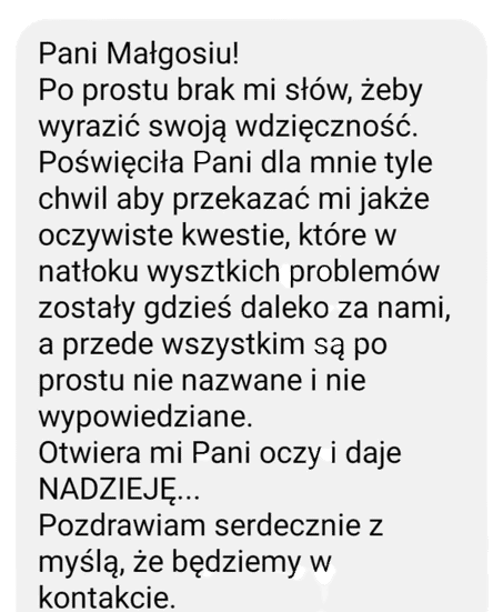 Małgosię miałam okazję poznać osobiście. Przeczytałam jej książkę, uczestniczyłam w spotkaniach.
