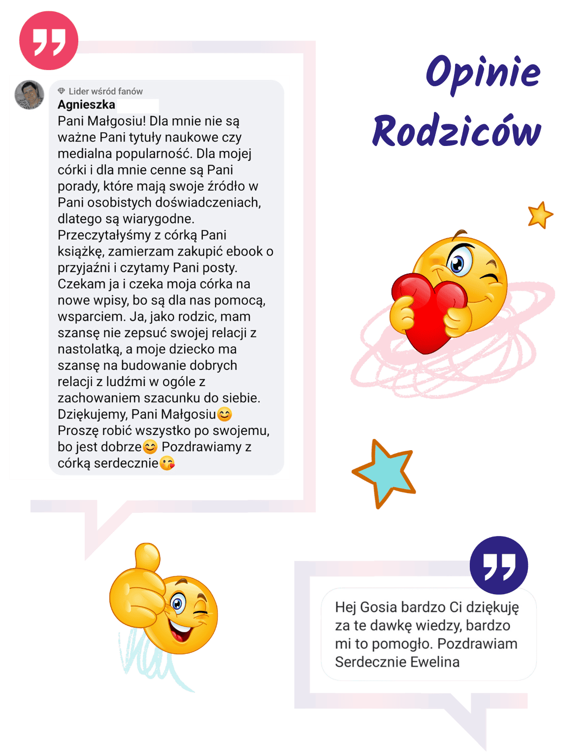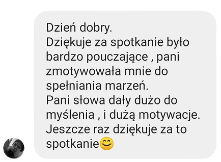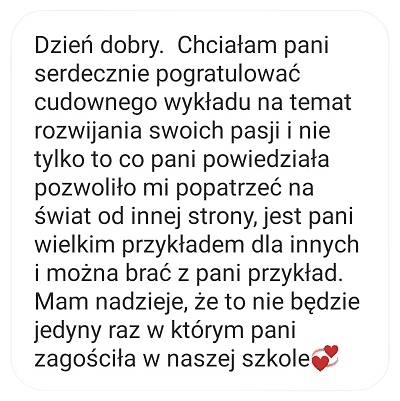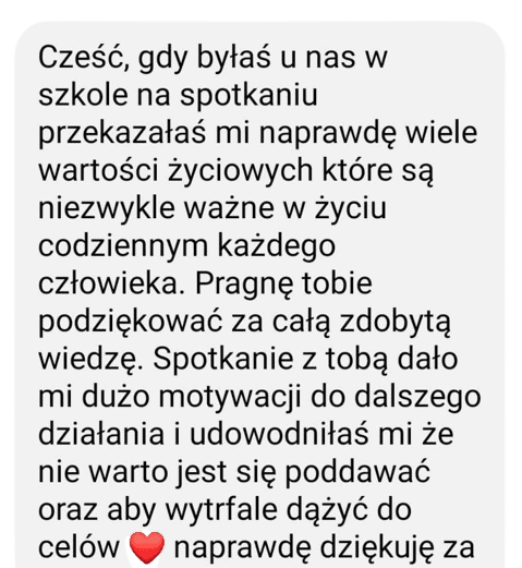Podziwiam Małgosię za szczerość i odwagę dzielenia się historią swojego życia. Ma w sobie siłę, wewnętrzną motywację i determinację, którą dzieli się z nastolatkami.